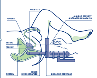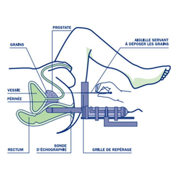 La curiethérapie prostatique est une technique validée de traitement du cancer de la prostate localisé. La technique actuelle repose sur la mise en place dans la prostate des grains radioactifs d’I125 selon un planning préétabli sur une échographie transrectale. Un «template » (grille perforée de forme carrée) est mis en place devant le périnée du patient pour guider les aiguilles qui permettront de mettre en place les grains radioactifs